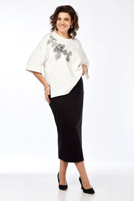 Комплект женский двухпредметный, состоит из джемпера и юбки. Джемпер прямого силуэта выполнен из трикотажного полотна. Горловина округлой формы обработана бейкой. Перед и спинка цельнокроеные. Рукава спущенные. Изделие декорировано дизайнерской вышивкой. Юбка заужена к низу, выполнена из плотного трикотажного полотна, пояс цельнокроеный на эластичной тесьме. В заднем шве юбки обработан разрез. Изделие на подкладке.