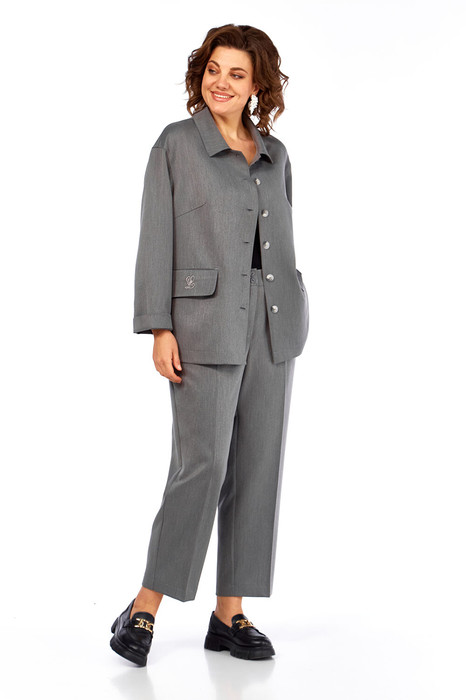 Костюм женский двухпредметный, состоит из жакета и брюк, выполнен из однотонной костюмной ткани. Жакет прямого силуэта со стояче-отложным воротником и центрально-бортовой застежкой на петли и пуговицы. По переду обработаны нагрудные вытачки и прорезные карманы с клапаном. Спинка на притачной кокетке. Рукава слегка спущенные. Брюки классической посадки, пояс притачной частично на эластичной тесьме. Застежка на петли и пуговицы. По передним деталям брюк обработаны карманы с листочкой. Костюм дополнен дизайнерской вышивкой.