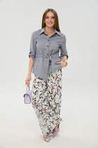 Костюм женский двухпредметный, состоит из жакета и брюк, выполнен из однотонной костюмной ткани. Жакет прямого силуэта со стояче-отложным воротником и центрально-бортовой застежкой на петли и пуговицы. По переду обработаны нагрудные вытачки и прорезные карманы с клапаном. Спинка на притачной кокетке. Рукава слегка спущенные. Брюки классической посадки, пояс притачной частично на эластичной тесьме. Застежка на петли и пуговицы. По передним деталям брюк обработаны карманы с листочкой. Костюм дополнен дизайнерской вышивкой.