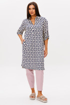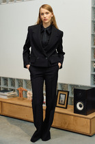 Костюм брючный двухпредметный, состоит из жакета и брюк, выполнен из ткани костюмно-плательного ассортимента. Жакет прямого силуэта. Горловина обработана воротником — стойка, застежка  центрально — бортовая на петли и пробивные  пуговицы. Перед с кокетками и рельефами выходящими из них. Имеются прорезные карманы с клапаном. Спинка на кокетке. Рукава рубашечного  типа. Жакет дополнен печатью. Брюки свободного силуэта слегка заужены к низу. Пояс притачной, частично на эластичной тесьме, с застежкой на петлю и пробивную пуговицу. По переду обработаны карманы с листочкой и подрезным бочком. Вдоль швов костюма проходят контрастные строчки из отделочных ниток.