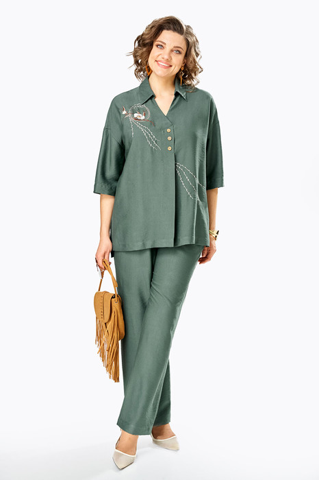 Костюм брючный, двухпредметный, состоит из блузы и брюк. Выполнен из ткани с эффектом крэша.  Блуза свободного силуэта с горловиной V-образной формы и стояче-отложным воротником. По переду обработана односторонняя складка с имитацией застежки. Спинка с фигурными подрезами, в районе талии, по центру кулиса присобранная на эластичную тесьму. Рукава спущенные. Блуза декорирована дизайнерской вышивкой. Брюки прямого кроя, классической посадки. Пояс притачной на эластичной тесьме. В передних деталях брюк обработаны карманы с подрезным бочком.