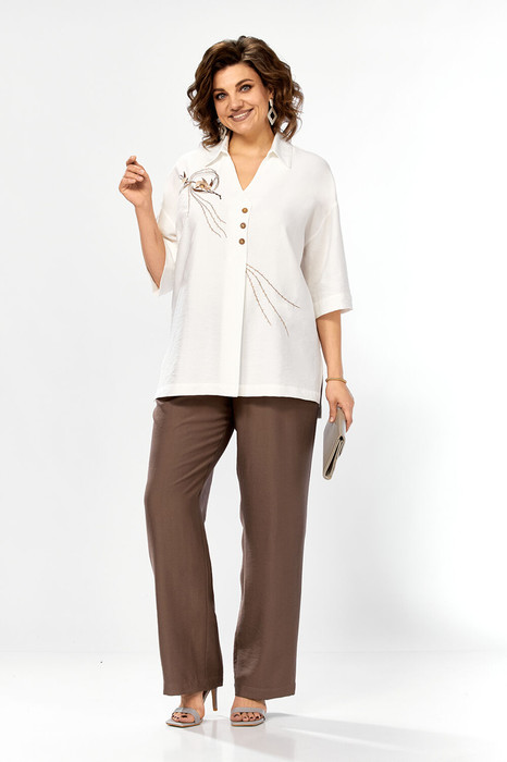 Костюм брючный, двухпредметный, состоит из блузы и брюк. Выполнен из ткани с эффектом крэша.  Блуза свободного силуэта с горловиной V-образной формы и стояче-отложным воротником. По переду обработана односторонняя складка с имитацией застежки. Спинка с фигурными подрезами, в районе талии, по центру кулиса присобранная на эластичную тесьму. Рукава спущенные. Блуза декорирована дизайнерской вышивкой. Брюки прямого кроя, классической посадки. Пояс притачной на эластичной тесьме. В передних деталях брюк обработаны карманы с подрезным бочком.