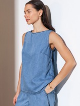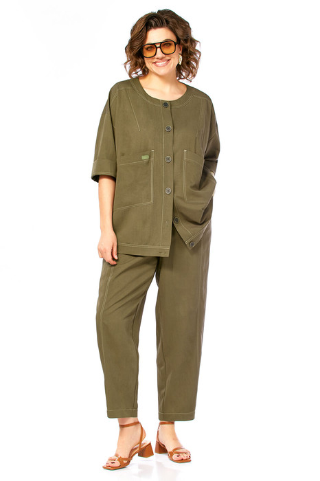 Костюм брючный 2-х предметный, состоит из облегченного жакета и брюк. Выполнен из костюмно-плательной ткани. Жакет свободного кроя. Горловина и низ изделия обработаны планками. На деталях переда обработаны кокетки, с вытачками от них и накладные карманы. Застежка — планка, на петли и пуговицы. По спинке кокетка и средний шов. Рукава спущенные с притачными манжетами. Декором служат отделочные строчки и логотип  на кармане. Брюки свободного кроя. На передних частях брюк обработаны фигурные подрезы и карманы. Пояс на резинке с застежкой на петлю пуговицу и тесьму-молнию. На задней части брюк — кокетки.