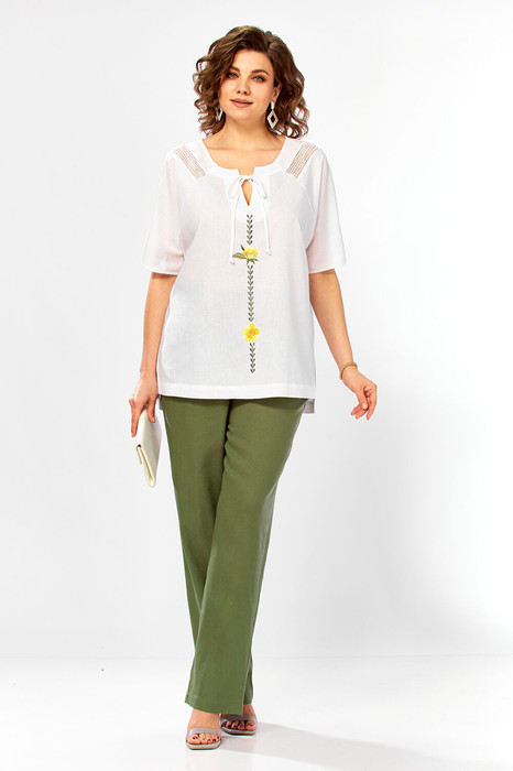 Костюм брючный, двухпредметный, состоит из блузы и брюк. Блузка свободного силуэта. По переду горловина V-образной формы с двумя планками и завязками. Спинка со встречной складкой. Рукава комбинированные: по переду — реглан, дополнены кружевной тесьмой, по спинке рукава цельнокроенные. Низ рукавов фигурной формы. В боковых швах обработаны разрезы. Низ изделия с перепадом длинны. Блузка дополнена вышивкой . Брюки прямого силуэта, с притачным поясом на эластичной тесьме. По передним деталям брюк обработаны карманы с подрезным бочком.