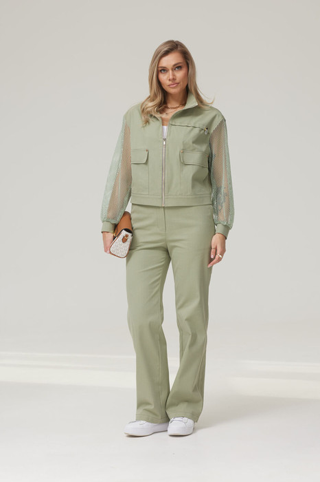 Блузон прямого силуэта, с центральной застежкой на декоративную молнию. По переду настрочены накладные карманы с боковым входом и декоративным клапаном. Клапаны декорированы металлическими хольнитенами и нашивкой. Слева обработана отрезная кокетка с резинкой и фиксатором. Спинка цельнокроеная, по низу со складками. Горловина округлой формы, обработана высокой стойкой. Рукав длинный, одношовный, выполнен из ткани-компаньона. По низу обработан притачной манжетой, застегивающейся на кнопку.  Низ изделия обработан широкой притачной планкой.