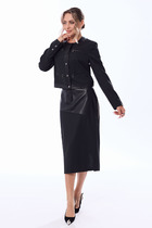 Блуза женская прямого силуэта закрывающая линию паха с цельнокроеными рукавами. К блузке прилагается съёмный декор – цветок. По боковым швам располагаются разрезы. Спинка с центральным швом и застежкой на навесную петлю и пуговицу. Горловина обработана косой бейкой. Рукав до локтя, низ рукава обработан отрезной отворачивающейся манжетой, закрепленной по швам. Низ блузки обработан швом «в подгибку».