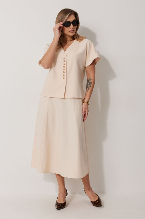 Костюм женский, состоящий из жилета и юбки. Жилет прямого силуэта на подкладке со спущенной линией плеча длиной до линии бедра. Спинка с центральным швом. Горловина V-образной формы обработана подбортом с обтачкой. Застежка жилета центральная на  декоративные пуговицы. Юбка на подкладке женская А – силуэта длиной до середины икры. Перед юбки состоит из 4 клиньев. Вверху передней части юбки располагается карман с отрезным бочком. Спинка юбки состоит из 4 клиньев. По среднему шву юбки находится застежка – молния.  Верхний срез юбки обработан обтачкой.