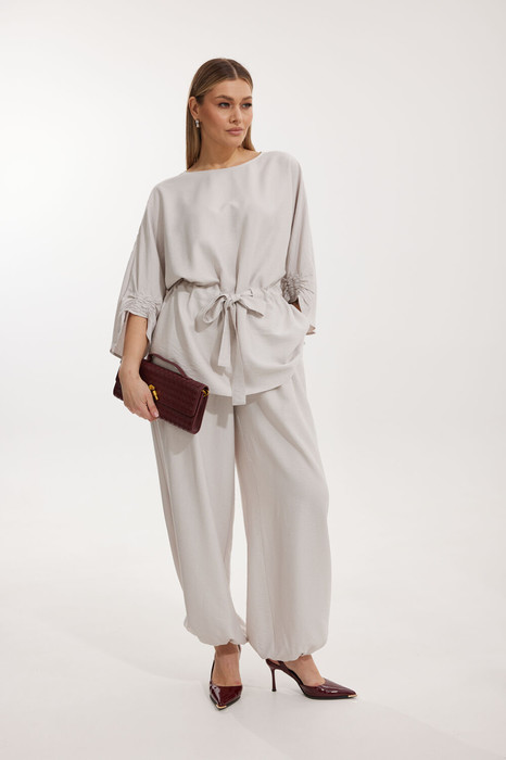 Блуза кроя «летучая мышь» длиной за линию бедра. Перед цельный с округлой горловиной. Спинка со средним швом. В районе талии обработана кулиса с широким поясом. По низу рукава по передней части выполнено несколько рядов сборки. Горловина обработана окантовкой.