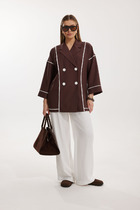 Блуза кроя «летучая мышь» длиной за линию бедра. Перед цельный с округлой горловиной. Спинка со средним швом. В районе талии обработана кулиса с широким поясом. По низу рукава по передней части выполнено несколько рядов сборки. Горловина обработана окантовкой.