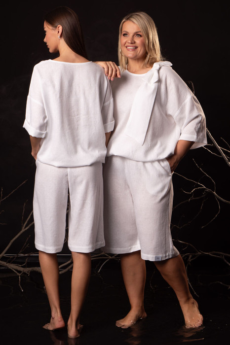 Женский костюм из льна с вискозой премиум-класса. Комплект: джемпер со съемным бантом в комплекте и шорты.