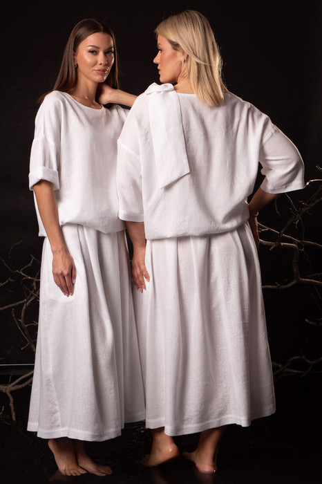 Элегантный костюм премиум-класса из белорусского льна с вискозой премиального качества — идеальный баланс романтики, практичности и экологичности. Набор включает джемпер свободного прямого кроя со съемным декоративным бантом и длинную юбку с эффектными встречными складками, боковыми карманами и потайной молнией. Натуральные материалы обеспечивают легкость, воздухопроницаемость и гипоаллергенность, сохраняя безупречный вид в любых ситуациях.