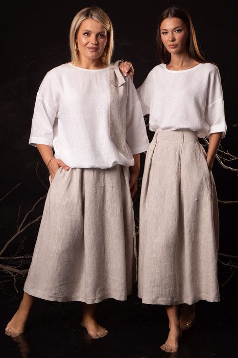 Элегантный костюм премиум-класса из белорусского льна с вискозой премиального качества — идеальный баланс романтики, практичности и экологичности. Набор включает джемпер свободного прямого кроя со съемным декоративным бантом и длинную юбку с эффектными встречными складками, боковыми карманами и потайной молнией. Натуральные материалы обеспечивают легкость, воздухопроницаемость и гипоаллергенность, сохраняя безупречный вид в любых ситуациях.