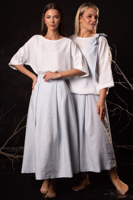 Элегантный костюм премиум-класса из белорусского льна с вискозой премиального качества — идеальный баланс романтики, практичности и экологичности. Набор включает джемпер свободного прямого кроя со съемным декоративным бантом и длинную юбку с эффектными встречными складками, боковыми карманами и потайной молнией. Натуральные материалы обеспечивают легкость, воздухопроницаемость и гипоаллергенность, сохраняя безупречный вид в любых ситуациях.