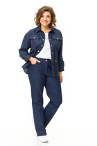 Жакет свободного силуэта, на подкладке. Воротник отложной пиджачного типа, застежка центральная на 2 петли и пуговицы. Перед жакета талиевыми вытачками от низа, с горизонтально расположенными боковыми прорезными карманами с листочками. Спинка с рельефными швами. Рукава втачные двухшовные, внизу обработан разрез и декоративно прикреплены «паты» с застежкой на 2 пуговицы. В компекте пояс из основной ткани.