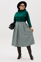 Юбка плотно облегающая вверху и зауженная к низу, на подкладке, длиной до коленей. Застежка на потайную тесьму-молнию в среднем шве заднего полотнища. Переднее полотнище юбки с запахом фигурной формы, вверху с горизонтальным подрезом и со складкой. Заднее полотнище со средним швом, на каждой половинке обработаны по две вытачки. Верхний срез юбки обработан обтачкой.