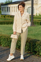 Брюки комплекта созданы в свободном стиле. В пояс брюк по спинке вставлена эластичная тесьма, шириной 3 см. Спереди пояс фиксируется горизонтально на петли/пуговицы и вертикалную закрытую клапан-молнию (гульфик).