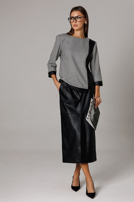 Блузон комплекта прямого силуэта, спереди расположены горизонтальные вытачки. В среднем шве спинки расположена застежка на потайную молнию. Горловина округлая, обработана обтачной деталью. Декоративным элементом выступает притачной бочок из эко-кожи с ассиметричной формой отделки низа блузона. Рукав втачной, одношовный. Низ рукава и низ блузона обработаны притачными планками из эко-кожи высотой 3,5 см. Длина рукава 44-45 см. Длина блузона по среднему шву спинки 57,5-60 см (в зависимости от рамерного ряда).
