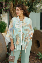 Стильный гармоничный комплект, состоящий из свободной блузы рубашечного покроя и брюками из джинса.