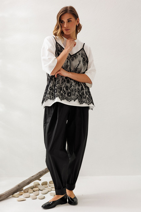 Блузон свободного силуэта, состоящий из футболки со спущенной линией проймы и укороченным втачным рукавом, длиной 26 см. Горловина округлая, оформлена планкой 2,5 см. Длина блузона по спинке 68 см. Низ изделия и рукавов обработаны открытым срезом с проложенной строчкой и ажурной майкой на бретелях. Срезы майки обработаны окантовочной тесьмой 0,7 см. Длина ажурной майки 65 см.