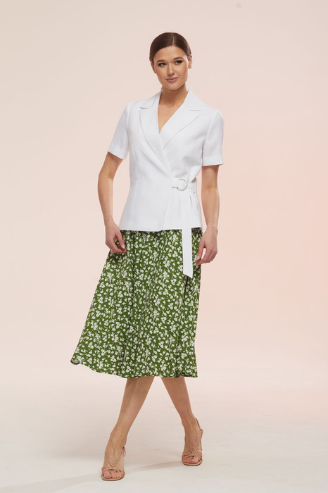 Стильный комплект, состоящий из жакета с коротким рукавом и юбки-клеш. Короткий жакет прилегающего силуэта с глубоким вырезом, отложным воротником формы «ласточкино крыло», застежкой на декоративную пряжку с поясом. Пояс акцентирует внимание на талию. По полочке и спинке для прилегания созданы рельефные бочки, по полочке дополнительно рельефная вытачка. Длина жакета по среднему шву спинки-61 см. Рукав втачной, одношовный, длиной 22.5 см. Полочка и спинка жакета на подкладке. Юбка комплекта в форме клеш. По талии полочки и спинке расположены вытачки. В среднем шве юбки потайная молния. Пояс притачной, шириной 4 см. По бокам пояса вставлена детально резинка ш.3.5 см, придавая дополнительную растяжимость для обхвата.