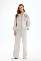 Шикарный комплект классических тонов черного и белого, состоящий из свободной блузы рубашечного кроя с вертикальной рюшей и современных брюк.
