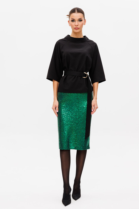 Юбка на подкладке прямого силуэта, чуть зауженная к низу. В среднем шве размещена потайная молния и открытый разрез. На линии талии размещены классические вытачки. Пояс внутренний, обтачной. Длина юбки по боковому шву-70 см. Высота разреза-21 см.