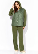 Комплект состоит из корсета, блузки и брюк. Корсет со шнуровкой по спинке. По рельефам спинки и переда вставлена регилиновая тесьма для сохранения формы. Особенностью корсета является пояс притачной по переду и отлетной по спинке. Брюки прямого свободного покроя на притачном поясе. Застежка на тесьму-молнию и пуговицу. По передним половинкам брюк функциональные карманы-хулиганы и складки. В пояс задней части брюк вставлена резинка. Блузка прямого силуэта со спущенной линией плеча. Рукав втачной, одношовный, длинный с притачной манжетой с разрезом. Воротник рубашечный с отрезной стойкой. Застежка на потайную планку на петли и пуговицы. По боковому шву разрезы.