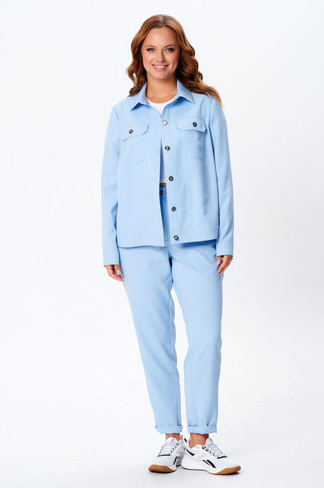 Жакет свободного кроя. Рукав втачной двух-шовный, низ рукава на притачной манжете с застёжкой на петлю и пуговицу. Воротник рубашечного типа на отрезной стойке. По переду накладные функциональные карманы с клапаном. По спинке отрезная кокетка. Спинка жакета длиннее чем перед. Брюки зауженные к низу. Верхний край брюк на притачном поясе, по спинке от боковых швов на резинке. Застежка брюк спереди по типу «гульфик». На задних половинках брюк накладные карманы, спереди карманы «хулиганы».