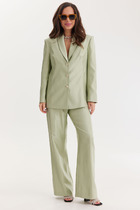 Шифоновая блуза свободного кроя, отрезная чуть выше линии талии, с двумя присборенными рюшами. Горловина округлой формы на завязках. Рукав втачной с присборенной рюшей. Низ блузы ассиметричный, спинка длиннее переда. Брюки выполнены из костюмной ткани со стрейчем. Верх брюк обработан обтачкой, в боковом шве потайная молния, на задних половинках брюк декоративные листочки.