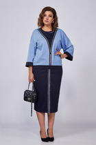 Комплект выполнен из хлопкового джинса.  Куртка на подкладке. Центральная застежка на кнопки. По переду наклонные карманы с листочкой в области талии. Спинка цельная. По низу куртки притачной пояс с резинкой, воротник стойка. Рукава втачные одношовные, по низу на манжете с широкой резинкой. Брюки на притачном поясе, от середины передних половинок и по спинке на резинке, заужены к низу. Застежка брюк спереди по типу «гульфик». По бокам карманы с наклонным входом. Сзади накладные карманы.