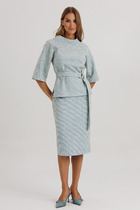 Блузка свободного кроя со спущенной линией плеча. Воротник рубашечного типа на отрезной стойке, центральная застёжка на петли и пуговицы. Низ блузки по спинке и переду собирается на кулису, которая может регулироваться по ширине. Рукав втачной, низ обработан притачной манжетой с застежкой на петлю и пуговицу. Брюки свободного кроя, на притачном поясе с эластичной тесьмой и потайным шнуром из основной ткани. В боковых швах карманы “ хулиганы”.