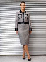 Жакет с округлым вырезом горловины и центральной застёжкой на потайные пуговицы и одну пришивную кнопку. На уровне талии съёмный пояс из основной ткани. Рукава цельнокроеные с изделием и с отворотами по низу. По отворотам и поясу идут отделочные строчки.