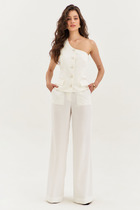 Брюки на поясе. Передние половинки со складками от пояса и наклонными карманами к боковым швам. Задние половинки с карманом в верхней части.