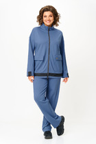 Жакет с фигурным вырезом горловины, двубортной застёжкой на петли и пуговицы и отрезной баской. Изделие со съёмным поясом. Перед с карманами с клапанами в нижнее части. Спинка со средним швом и двумя рельефами до баски. Рукава втачные.