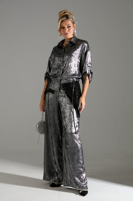 Костюм 2ка, состоящий из рубашки и брюк. Рубашка на пуговицах объёмного силуэта. Рукава дополнены шлейкой с застёжкой на пуговицу для сборки. Брюки широкого объема, прямого силуэта.