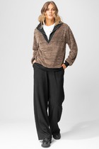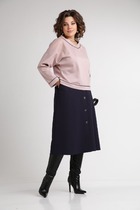 Комплект 2ка, состоящий из трикотажного джемпера и брюк. Джемпер свободного силуэта cо спущенным плечом. Круглый вырез горловины. Низ блузки ассиметричный , удлинён с одной стороны. Брюки широкого объема, прямого силуэта. На передних половинках брюк заутюжены стрелки, переходящие в складки по линии талии. На задних половинках также заутюжены стрелки. В боковых швах расположены карманы. Застежка-гульфик. Пояс отрезной, притачной. В задней части пояса вставлена эластичная тесьма (резинка). На пояс настрочены шлевки. Выступающая часть пояса застегивается на петлю и крючок. СОВЕТ ОТ СТИЛИСТА: нежный образ отлично подчеркиваю аксессуары с жемчугом. Для кэжуал образа обуйте бежевые или белые лоферы и вместительную сумку-шоппер.