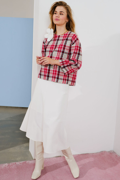 Костюм состоит из топа и юбки. Топ выполнен из текстильной ткани, дизайн клетка, на трикотажной подкладке. Линия плеча спущена, рукав укороченный 3/4. По переду округлый вырез горловины. По спинке застёжка на петли и пуговицы. Юбка А-силуэта на притачном поясе, на подкладке. По передней части юбки средний шов, по задней части юбки средний шов, переходящий в застёжку на потайную молнию. В комплектацию входит костюма входит брошь ручной работы.