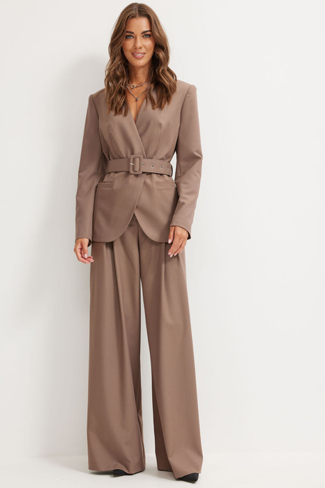 Жакет полуприлегающего  силуэта из костюмной ткани.  Жакет с двубортной застежкой и  V-образным вырезом  горловины. Рукав втачной  двухшовный. По переду функциональные  карманы с листочкой, рельефы  и нагрудные вытачки.  На спинке средний шов и талиевые вытачки. Жакет на подкладке. В комплект входит ремень. Обращаем ваше внимание, что фурнитура может отличаться от фото.