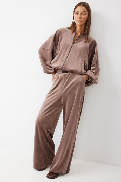 Брюки прямого силуэта из комфортного трикотажного полотна. По верху брюк притачной пояс на резинке с декоративной нашивкой. На передних половинках обработаны карманы. Ширина брюк по низу регулируется за счет эластичной тесьмы и фиксаторов. Обращаем ваше внимание, что фурнитура может отличаться от фото.