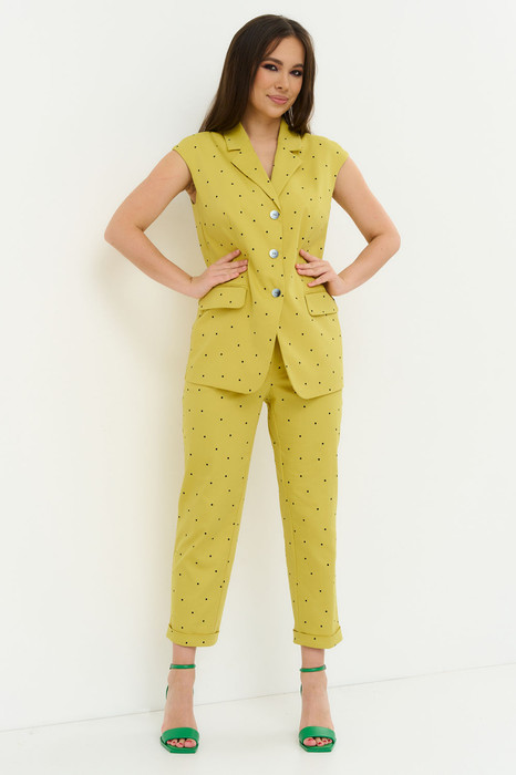 Элегантный хлопковый комплект, состоящий из удлиненного жилета и брюк. Жилет полуприлегающего силуэта с центральной застежкой на пришивные пуговицы. Дополнен боковыми функциональными карманами с клапанами. Брюки прямого кроя, слегка заужены книзу, с притачным поясом, дополненным эластичной тесьмой. Застежка на молнию и пришивную пуговицу. Дополнены боковыми карманами. Длина жилета от плечевого шва 69 см. Длина брюк по боковому шву 88 см.