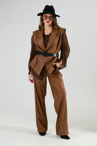 Элегантный комплект из блузы и юбки в бежевых тонах. Блуза . свободного кроя со спущенным рукавом. Выполнена из фактурного трикотажного полотна средней плотности. Горловина округлой формы. По груди отделка декоративной тесьмой и бусинами. По спинке застежка на металлическую молнию. Юбка прямого классического кроя на подкладке. По спинке застежка на потайную молнию. Длина блузы от плечевого шва 61см. Длина рукава 56см. Длина юбки 74см.