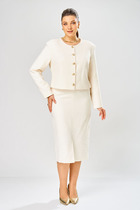 Стильный комплект из жакета и юбки. Выполнен из комфортной костюмной ткани красивого темно-синего цвета в меловую полоску.Жакет прямого кроя, без подкладки, с центральной застежкой на потайные кнопки. Горловина обработана отложным воротником. Рукав втачной. Жакет дополнен функциональными накладными карманами с клапанами. Юбка прямого классического кроя на подкладке. По спинке застежка на потайную молнию. Комплект дополнен съемным галстуком с оригинальной регулировкой.Галстук выполнен из основной ткани. Длина жакета от плечевого шва 55см. Длина рукава 59см. Длина юбки 75см.