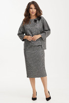 Элегантный комплект, состоящий из блузы и юбки, выполненных из мягкой костюмной ткани. Блуза свободного силуэта со спущенным рукавом . Горловина округлой формы. По спинке в средний шов вставлена молния. Юбка классического кроя, заднее полотнище со средним швом, застегивается на потайную молнию. Шов переходит к низу в шлицу. Боковые швы юбки сдополнены бархатной тесьмой. Длина блузы по переду от плечевого шва 61 см., по спинке- 65см. Длина рукава 51 см. Длина юбки 74 см.