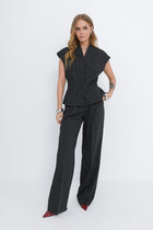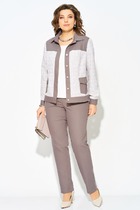 Стильный компект из жакета и брюк. Двубортный жакет выполнен из костюмной ткани в комбинации с темно-синим джинсом. Жакет на подкладке с застежкой на пришивные пуговицы. Рукав втачной, дополнен манжетой из джинса. Воротник отложной. Брюки классического прямого кроя с притачным поясом, выполненным из джинса, дополненным эластичной тесьмой. Посадка средняя. Дополнены удобными боковыми карманами. Застежка гульфик на молнию и пришивную пуговицу. Брюки выполнены из комфортной костюмной ткани. Длина жакета от плечевого шва 58см. Длина рукава 60см. Длина брюк по боковому шву 104см.