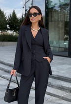 Комплект женский , состоящий из жилета и брюк. Жилет полуприлегающего силуэта на подкладке с застёжкой на петли и пуговицы. Спинка со средним швом, на уровне алии хлятик с застёжкой на 2 пуговицы. По переду вытачки и прорезной карман с листочкой. Брюки классические . Спереди застёжка на молнию и пуговицу.Сзади вытачки. В боковых швах карманы с отрезным бочком.Пояс с резинкой по спинке, дополнен шлёвками.