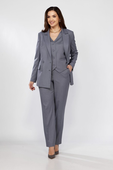 Комплект, состоящий из жакета, жилета и брюк. Жилет полуприлегающего силуэта на полной подкладке и застежкой на пуговицы. По переду прорезной карман, сзади - хлястик с застежкой на 2 пуговицы. Брюки свободного силуэта с косыми карманами. Пояс брюк прямой. Застежка на пуговицы и молнию. Жакет женский полуприлегающего силуэта на двубортной застёжке на четыре пуговицы. По спине средний шов со шлицей. Карманы прорезные с клапанами и двумя обтачками. Рукав двухшовный со шлицей и декоративными пуговицами.