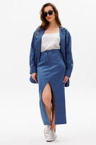 Универсальный  женский брючный костюм для повседневной носки, а также торжественных мероприятий, выполнен из однотонного легкого костюмного материала . Жакет удлиненный с ассиметричным низом, распашной с раскладным бортом. Спинка с центральным швом. Рукав втачной одношовный с цельнокроеной манжетой . Жакет со съемным поясом на застежке-карабине. По правой стороне переда настрочной карман -книжка. Брюки- палаццо, длинные с карманами в боковых швах ,на поясе с резинкой. Украшением данного костюма служат декоративный карман по переду и брошь. Оба изделия отлично сочетаются между собой и могут легко создавать интересные комбинации с другими изделиями вашего гардероба. Под жакет можно надеть любой легкий топ. Длина футболки по спинке 77 см (в самой низкой точке),  длина рукава от горловины шва 40 см. Длина брюк по боковому шву 111 см +-1 см, по шаговому 82 см +-1 см. Изделие подойдет на рост 170 см.