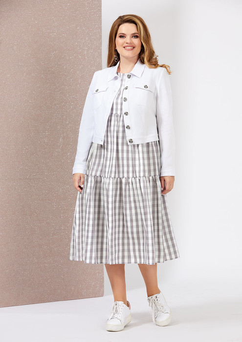 Стильный комплект, состоящий из джинсовой куртки и платья в стиле бохо. Куртка выполнена из эластичной джинсовой ткани. Куртка с центральной застежкой на петли и пуговицы, со стояче-отложным воротником, кокетками по переду и спинке, рельефами и настроченными карманами с клапанами. Все швы отстрочены двойной декоративной строчкой. Куртка с втачным, длинным рукавом с притачной манжетой, которая застегивается на петлю и пуговицу. Платье с втачным коротким рукавом, к низу которого притачено кружево. Чуть выше линии талии и выше колена подрезы со вставками из кружева поверх основной ткани. От подрезов легкая сборка. По спинке у горловины застежка на навесную петлю и пуговицу.