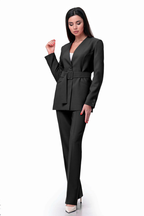 Костюм двухпредметный состоит из жакета и брюк. Элегантный дизайн костюма с брюками подарит комфорт и уверенность в себе. Жакет с центральной застежкой на 2 петли и пуговицы с прорезными функциональными карманами по переду. Рукав втачной двухшовный со шлицей декорированной пуговицами. Брюки прямые от линии калена, застежкой в боковом шве на потайную молнию. В комплект входит пояс с пряжкой. Костюм двойка отлично подойдет для офиса, для праздника, на каждый день для прогулок. Длина жакета 69 см, длина брюк 110 см
