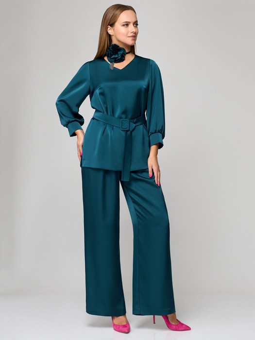Комплект женский двухпредметный.  Блузка - прямого силуэта с V-образным вырезом горловины. По спинке застежка на 3-петли и пуговицы. В боковых швах разрезы. Рукав втачной со складкой по низу с манжетой. Брюки классического покроя, прямые от бедра. В боковых швах карманы с отрезными бочками. Пояс отрезной со шлевками. Застежка на молнию и петлю с пуговицей. Изделие дополнено съемным поясом из основной ткани на пряжке. Длина блузки 69 см, длина рукава 52 см, длина брюк 106 см. Украшение в комплект не входит.